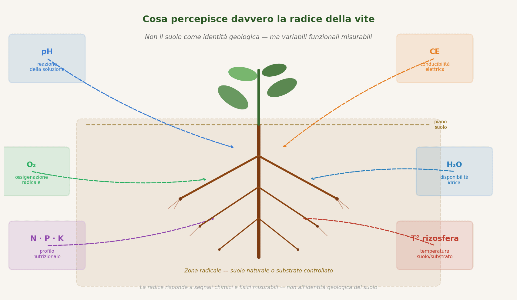 Schema dei parametri percepiti dalla radice della vite: pH, CE, O₂, H₂O, nutrienti, temperatura